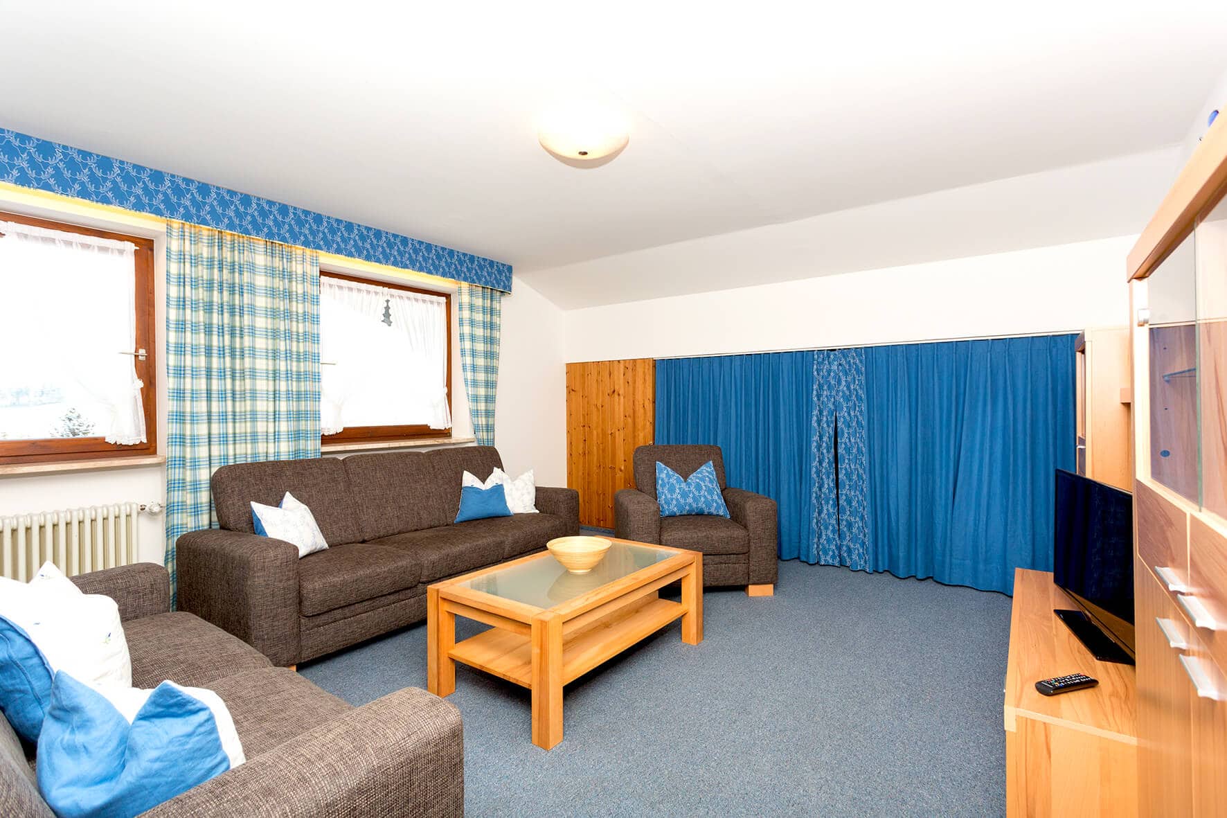 Elternschlafzimmer, Zwei-Bettzimmer mit getrennten Betten, Wohnzimmer mit zwei vollwertigen Betten.