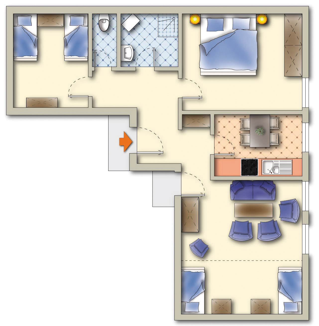 Unsere große Ferienwohnung 19 (ca. 84 m², bis 6 Personen) im Dachgeschoss besteht aus einem Elternschlafzimmer, einem Zwei-Bettzimmer mit getrennten Betten, einem Wohnzimmer mit zwei vollwertigen Betten, Dusche, separatem WC, Küche, Sat-TV/Radio, Telefon, Safe und WLAN.